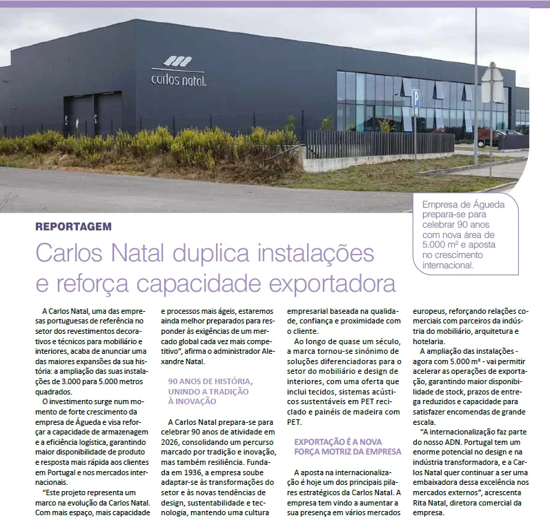 A Carlos Natal, uma das empresas portuguesas de referência no setor dos revestimentos decorativos e técnicos para mobiliário e interiores, acaba de anunciar uma das maiores expansões da sua história: a ampliação das suas instalações de 3.000 para 5.000 metros quadrados.