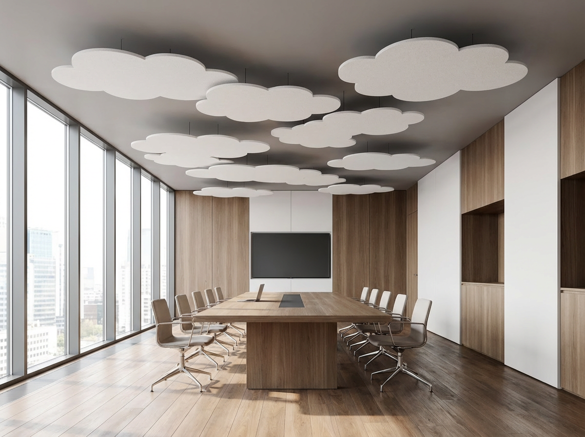 As nuvens acústicas são painéis PET suspensos que flutuam no teto, ajudando a controlar o som sem sobrecarregar o espaço visualmente.